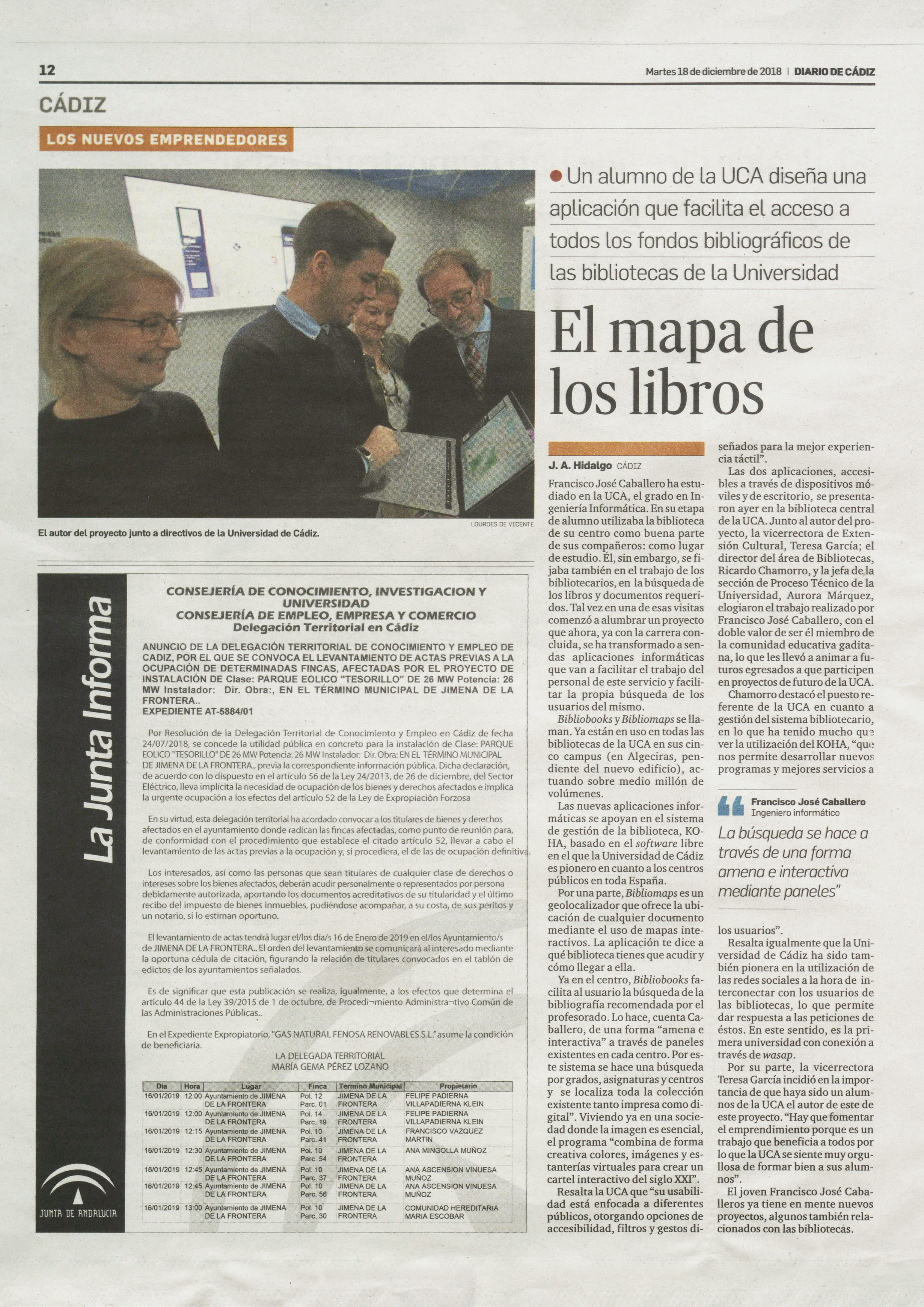 Diario de Cádiz, Un sistema informático para buscar libros en la UCA 18-12-2018 (Prensa digital)